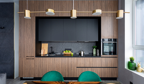 Для комнаты на северной стороне используйте более яркие акценты и вставки. Так, поверхности кухни коричневых цветов можно разбавить желтыми, алыми или оранжевыми оттенками. Такая комбинация внесет в пространство немного тепла и будет смотреться позитивно и интересно.
