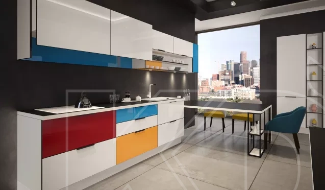 Минимализм. Для любителей минимализма подойдет установка однотонного гарнитура с матовыми шкафчиками без ручек. Тона лучше выбрать контрастные, чтобы мебель не смотрелась скучно.