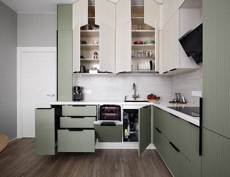 Индивидуальный заказ позволяет создать проект, идеально вписывающийся в любое пространство — от малогабаритной кухни в хрущёвке до просторного помещения в доме. При стандартных решениях всегда есть компромиссы: ниши, углы, выступы. При индивидуальных размерах дизайнер учитывает каждую деталь, чтобы использовать площадь рационально.