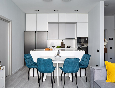 Студийные планировки предполагают открытое пространство, где кухня плавно переходит в гостиную. Здесь важно объединить стиль, подобрать одинаковые материалы для фасадов и столешниц, чтобы пространство выглядело гармонично.