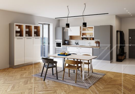 При выборе фасадов для маленькой кухни лучше остановиться на светлых оттенках, таких как белый, серый, песочный (под дерево). Многие считают, что светлые гарнитуры менее практичны, но это не всегда так – они удачно вписываются в интерьер и создают ощущение простора. Если хочется выбрать что-то более оригинальное и не слишком темное, то присмотритесь к серой гамме. Она легка в уходе и подходит для интерьеров разных стилей – от прованса до американской классики.