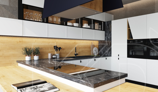 Г-образная планировка кухни идеально подходит для компактных и средних пространств. В этом случае мойку обычно устанавливают в свободном углу. Также его могут использовать для интеграции дополнительной полки или шкафчика.