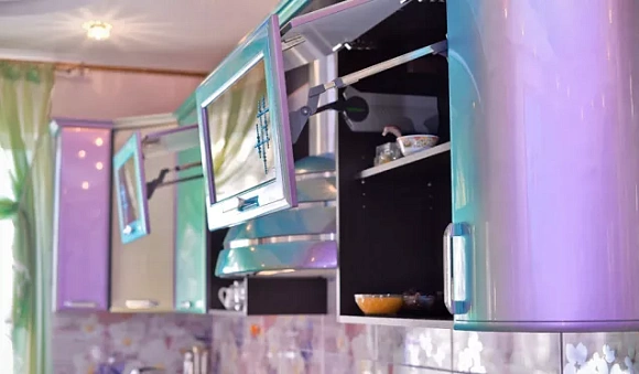 Кухня хамелеон выпускается в разных тонах: бирюзово-лавандовом, сине-зеленом, горчичном и иных. Главным минусом подобной кухни считается завышенная стоимость. В основном гарнитур хамелеон производят под заказ, чтобы он отлично вписался в интерьер.