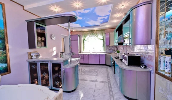 В том случае, если вы решили оформить кухню в фиолетовых тонах хамелеона, стоит обратить внимание на сиреневые и оранжевые оттенки в оформлении других элементов помещения. Некоторые детали должны быть светлыми. Например, подвесные потолки можно сделать ярко-белыми, добавить вытяжку или оформить ручки в светлых тонах. Также не рекомендуется оформлять пол и стены в темных тонах, так как это визуально сделает кухню менее просторной.