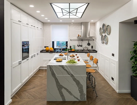 Другой не менее популярный вариант – светлый гарнитур с островом в стиле сканди. При оформлении подобного пространства используются элементы из натуральных материалов – камня и дерева. За счет этого дизайн помещения выглядит сдержанно и гармонично.