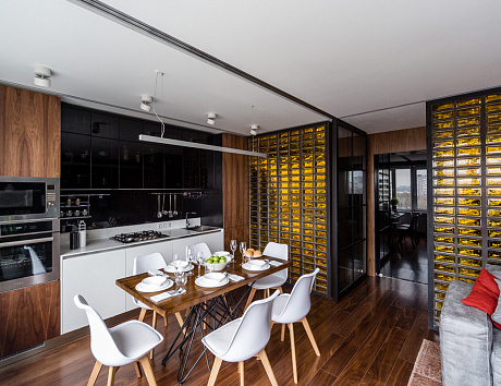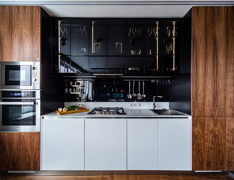 Самый простой в реализации. Здесь нельзя в полной мере воплотить идею «эргономичного треугольника», но в такой конфигурации кухня предстаёт во всей красе. Особенно эффектно смотрится линейный кухонный гарнитур для маленькой кухни, выполненный в ультра- или высоком глянце. При этом помещение должно иметь хорошую инсоляцию и яркое искусственное освещение. Обилие света создаст в глянцевых фасадах игру отражений, что визуально расширит окружающее пространство. А если, напротив, хочется «камерности» и уюта – можно выбрать фасады с натуральной древесной фактурой.