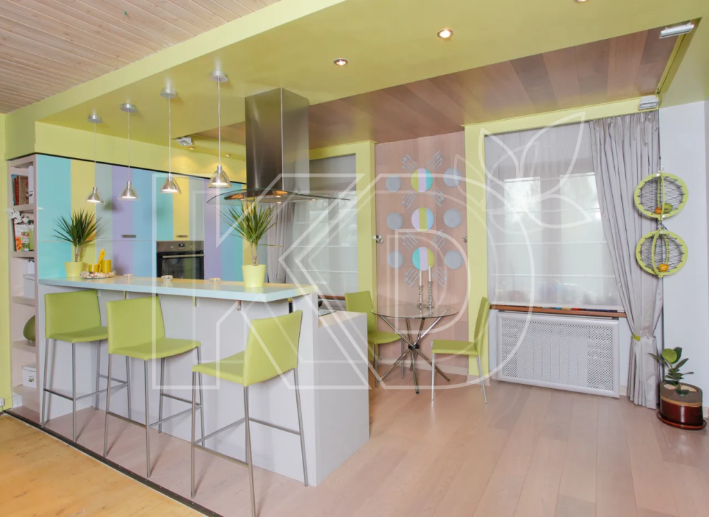 При этом нижний блок лучше выполнить в темно-зеленом цвете, а верхний – в нейтральном белом. Подчеркнуть свежесть поможет светлая столешница. Еще один цвет можно ввести в качестве акцента. Это может быть какой-то из элементов декора, например, ярко-желтый.