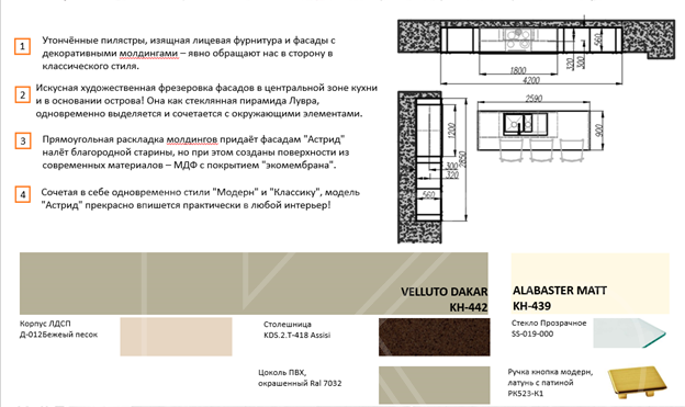 Под кухней «Астрид» подразумевается пространство в помещении, выделенное для приготовления пищи, использования с целью отдыха и комфортного времяпровождения. В современном обществе идеальным становится применение смешения стилей и мебельных композиций, придающих целевое назначение предметам, очерчивающим функциональные зоны кухни.