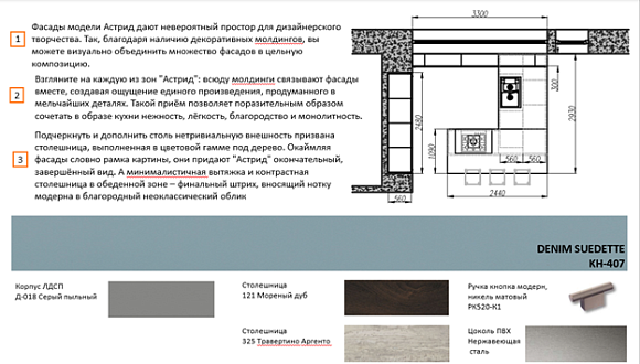Предложенная модель Астрид относится к кухням классик модерн, который сочетает в себе современное оформление и при этом традиционную прочностью и практичность. Мы предлагаем только вариант дизайна и мебели, а вот размер уже создается согласно параметрам именно Вашей комнаты.