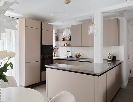 Г-образные кухни особенно хорошо подходят семьям, в которых традиционно готовкой любят заниматься несколько человек одновременно. Также такие кухни дают возможность установить дополнительную рабочую поверхность, например, барную стойку или компактный обеденный стол. Как итог, пространство становится более универсальным.