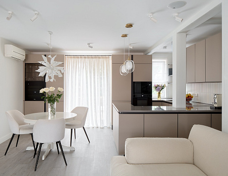 Дизайн кухни-гостиной почти всегда нуждается в зонировании. Для этого используют барные стойки, острова, разную отделку пола, стен или потолка. При этом важно сохранить целостность стиля и учитывать, что технику лучше подбирать с низким уровнем воспроизводимого шума. Для небольших квартир лучше выбрать встроенную технику и лаконичный гарнитур, чтобы кухня не выбивалась из общего интерьера. Также рекомендуем установить мощную вытяжку, чтобы запахи от готовки не мешали вашим домочадцам.