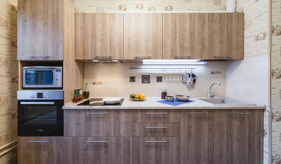 Часто для меблировки кухни доступна только одна стена, поэтому хозяйки выбирают линейную кухню. Таким образом, высокие шкафы, тумбы со столешницей, варочной панелью и раковиной, а также навесные шкафы объединены в одну линию для компактного и функционального размещения.