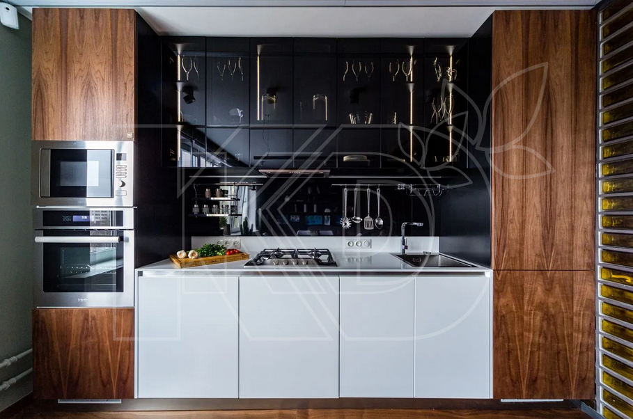 - Визуально уравновесить узкое и длинное помещение помогут шкафы-колонны. Одновременно они позволят разместить большее количество необходимой утвари на маленькой прямой кухне. Также колонны можно использовать для монтажа встроенной бытовой техники. Это выглядит стильно.