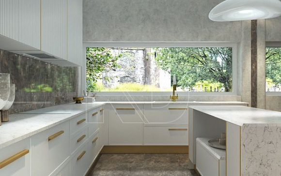 На завершающем этапе зазор между стеной и столешницей закрывают плинтусом, устанавливают полки и выдвижные ящики, встроенную бытовую технику, мойку, монтируют фасады.