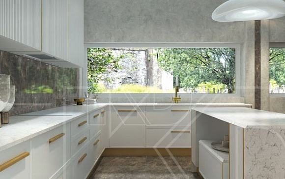 На завершающем этапе зазор между стеной и столешницей закрывают плинтусом, устанавливают полки и выдвижные ящики, встроенную бытовую технику, мойку, монтируют фасады.