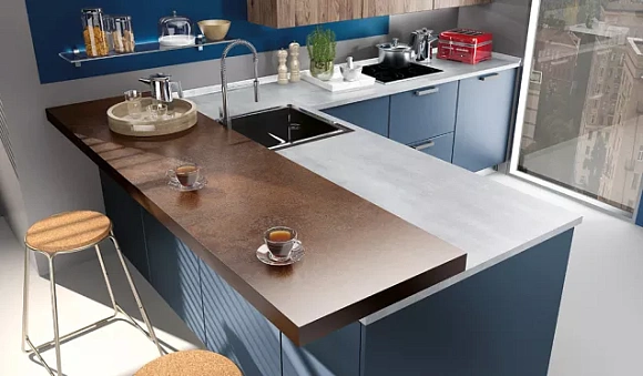 Если вы хотите получить благородную кухню, то объедините синий и серый оттенки. Первый из них должен быть основным, а второй (металлик) – добавочным.