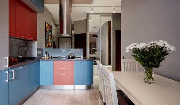 П-образные кухни – пусть главным архитектурным элементом зонирования станет полукруглая ажурная перегородка из гипсокартона. Эта конструкция визуально отделяет зону отдыха от остального пространства и является центром интерьерной композиции. Полукруглая форма перегородки нашла повторение в очертаниях разноуровневого потолка и раскладке напольного покрытия.
