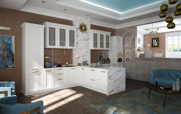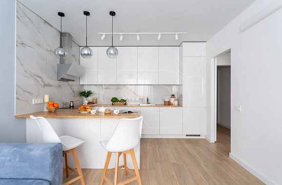 Белая кухня будет гармонично смотреться и в просторном помещении, например, большой столовой или квартире-студии. Она создаст вокруг ощущение чистоты и уюта, наполнит атмосферу воздухом и светом. И если в условиях недостатка места лучше предпочесть стандартные прямые или угловые гарнитуры, то на большой площади можно с комфортом разместить модель с функциональным островом, полуостровом или барной стойкой.