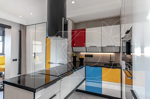 Не менее просто внести в интерьер кухни яркие оттенки. Поскольку белый сочетается абсолютно со всеми цветами, вы можете экспериментировать и давать волю своей фантазии: выбирать яркий или сдержанный цвет обоев и занавесок, украшать фартук красочной фотопечатью или заказать гарнитур, часть фасадов которого окрашена в контрастный синий, желтый, красный или другой насыщенный тон.