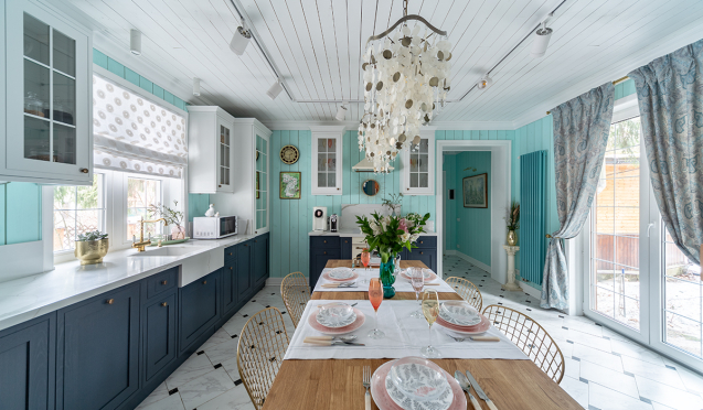 Применение натуральных, экологически чистых материалов. Самый популярный – натуральное дерево. Также для обустройства кухни выбирают натуральный камень, текстиль (на основе хлопка, льна, джута и так далее). Если бюджет ограничен, то можно выбрать качественные заменители.