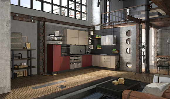 Это стены в виде кирпичной кладки или обычного бетона, деревянные полы, неприкрытые коммуникации (трубы, отдушины, провода и т.д.). Должно возникать ощущение нахождения именно в промышленном помещении. П-образные кухни и кухни с островом отлично для этого подходят, поскольку они используются в большом помещении без лишних стен и перегородок.