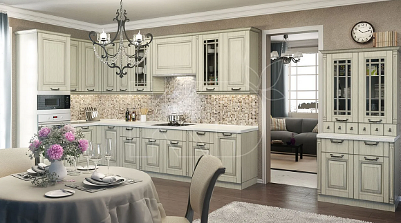 Цветовая палитра, в которой оформляется мебель, отличается богатым выбором оттенков. Кухонный гарнитур может быть светло-оливкового, песочного, голубого, светло-серого, молочно-белого и бежевого цвета с кварцевой, ониксовой, мраморной, искусственной гранитной или деревянной столешницей.