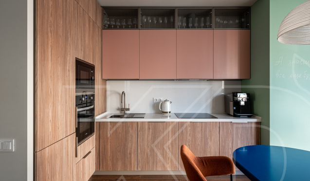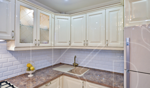 Угловые. Занимают место возле двух смежных стен, подходят для средних помещений. В угол обычно встраивается мойка и дополнительный шкаф.