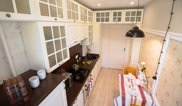 Линолеум. Отличается практичностью, доступной стоимостью и широким ассортиментом. Для отделки светлого кухонного пространства подходят версии, имитирующие природные материалы и оттенки.