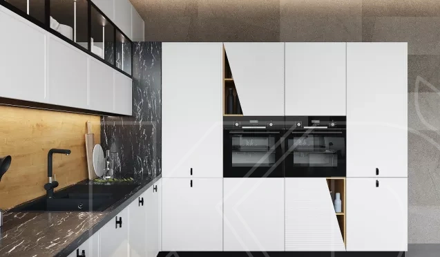 К светлой мебели можно подобрать рабочую поверхность и кухонный фартук в любых расцветках и фактурах. Очень часто используются контрастные версии. Например, коричневого, черного или серого цвета.