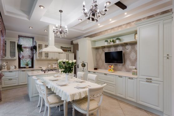 - Светлая кухня смотрится роскошно. Это символ богатства, который, как никогда, помогает подчеркнуть успешность членов семьи.