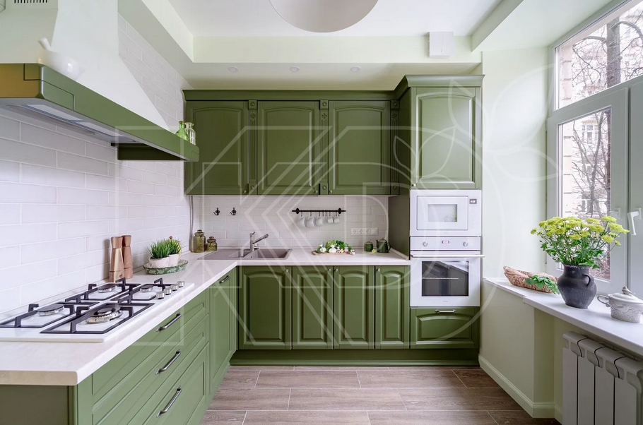 Одним из наиболее удачных вариантов считается угловая кухня в зеленом цвете – она помогает рационально использовать пространство и сделать процесс кулинарного творчества максимально удобным.