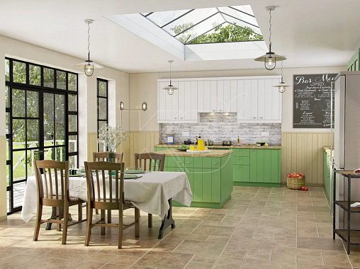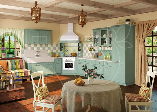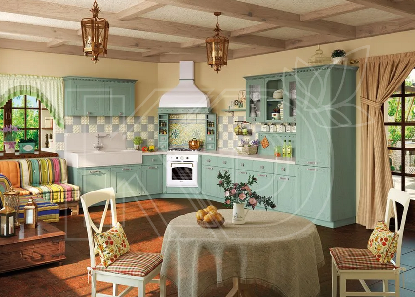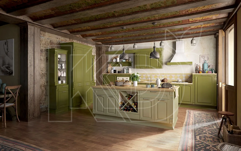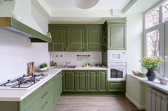 - Возможность реализации разнообразных стилистических концепций. Угловые кухни оливкового цвета хорошо смотрятся как в классическом, так и в современном исполнении.