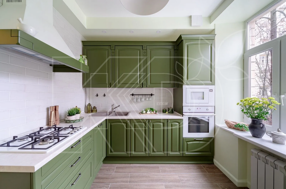 Среди широкого разнообразия цветовой палитры заслуженным спросом пользуются угловые кухни оливкового цвета. Данный оттенок оптимален для помещений любой площади, так как его нейтральность универсально хорошо подходит как для просторных, так и для компактных кухонь.