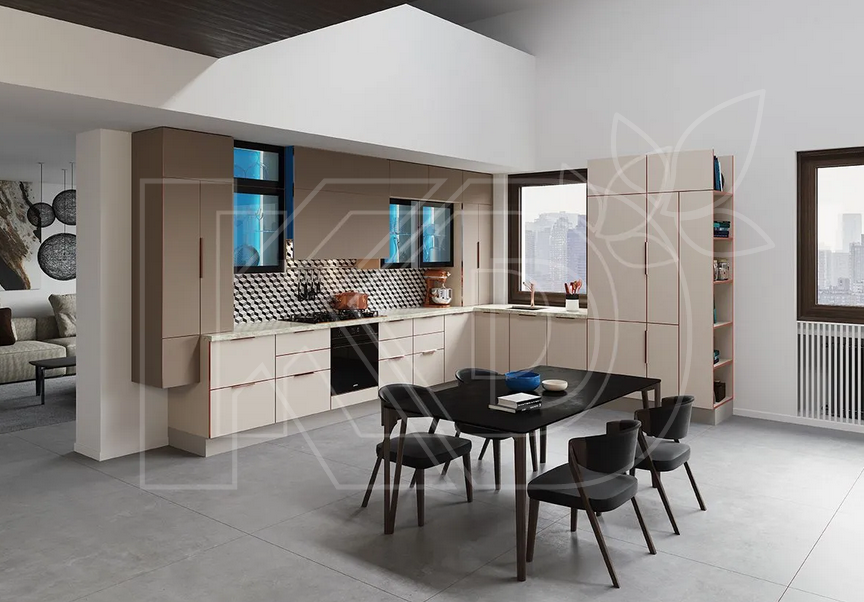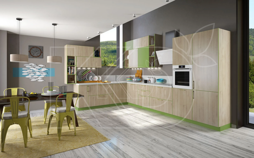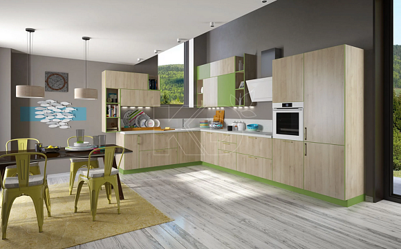 Угловые кухни модерн могут быть изготовлены из массива дуба, бука или ясеня и выполнена в любом дизайне и оттенке. Для изготовления фасадов мебели также могут применяться такие прочные материалы, как МДФ и ДСП. При производстве некоторых моделей используются экоплита, экомассив, экомембрана и шпон.