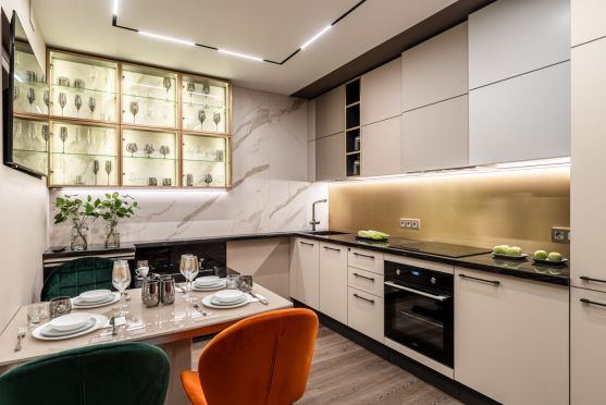Угловая кухня позволяет замаскировать отдельные, не самые привлекательные коммуникации. Например, водопроводные трубы или вентиляционную систему.