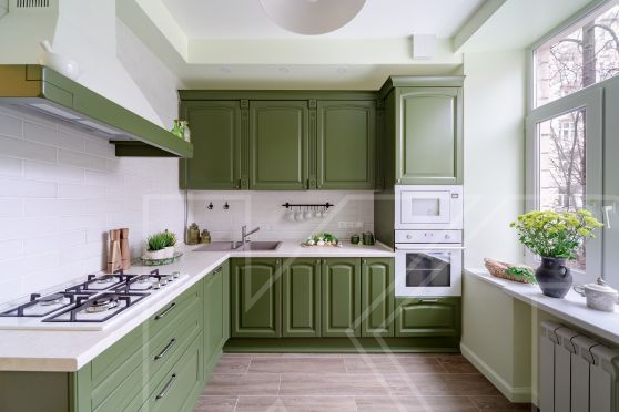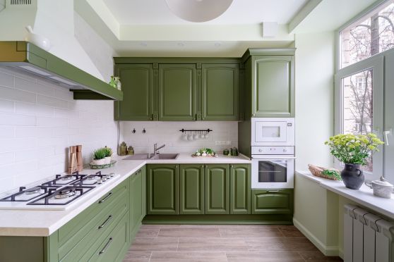 Любители эко-стиля ценят естественные цвета и фактуры, обилие комнатных растений. Для них лучшим вариантом станет зеленая кухня. Аксессуары из натурального камня и дерева прекрасно дополнят гарнитур такого оттенка.