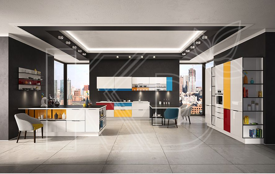 В помещении, где царят яркие краски, вам будет комфортно готовить и приятно общаться с друзьями и родными. Кроме того, такое оформление интерьера позволяет воплотить в жизнь любые свои дизайнерские фантазии и задумки, а также обустроить удобное рабочее место для повара и комфортную обеденную зону для всей семьи.