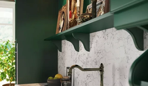 Например, для помещения больших размеров с высокими потолками подойдет классическая зеленая кухня. Подобные гарнитуры обычно выполняют в изумрудных, малахитовых, коричнево-зеленых тонах. Для их декоративного оформления используют резные узоры, лепнину, позолоту, патину.