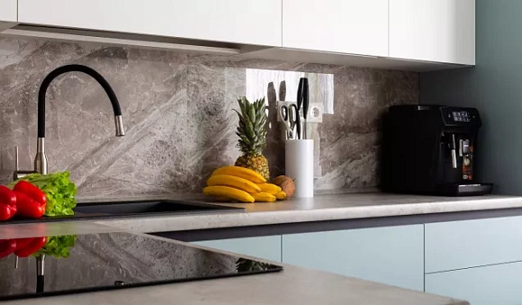 Для маленькой кухни желательно выбрать столешницу белого, бежевого или светло-серого цвета. Сохранить воздушность и свет позволяет модель в тон фасадам.