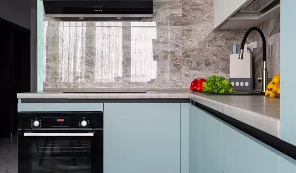 Столешница из натурального или искусственного камня украсит зеленый кухонный гарнитур в стиле кантри или сканди. Для минималистичных моделей можно использовать закаленное стекло, высокопрочный пластик или металл.