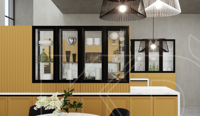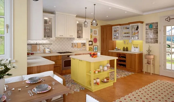 Широкий ассортимент. Производители выпускают разные кухни в желтых цветах – лофт, кантри, неоклассика, модерн, сканди, хай-тек, арт-деко.