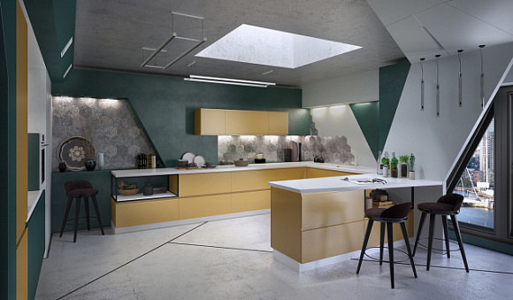 Островной кухонный гарнитур желтого цвета – идеальное решение для квартиры-студии. С его помощью можно визуально отделить обеденную часть от гостиной. Также остров используют для установки плиты или мойки, если позволяют коммуникации.