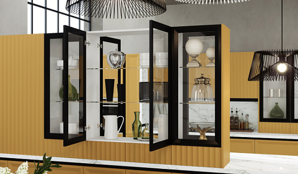 В просторных помещениях можно использовать сочетание черного с желтым. Такой дуэт выглядит очень смело и интересно. Конечно, темный оттенок в этом случае используется умеренно. Например, для оформления столешницы, цоколей, навесных полок.