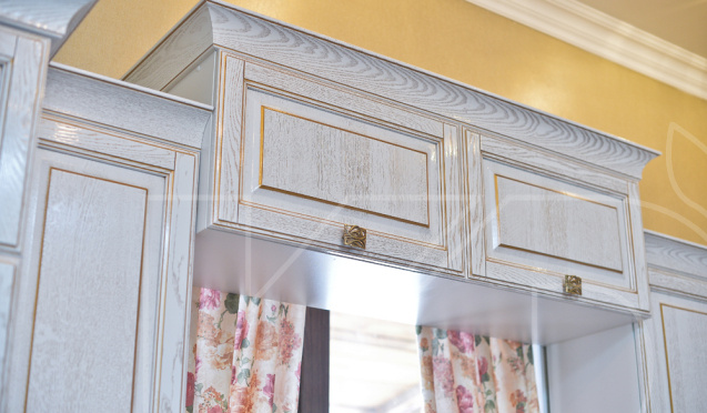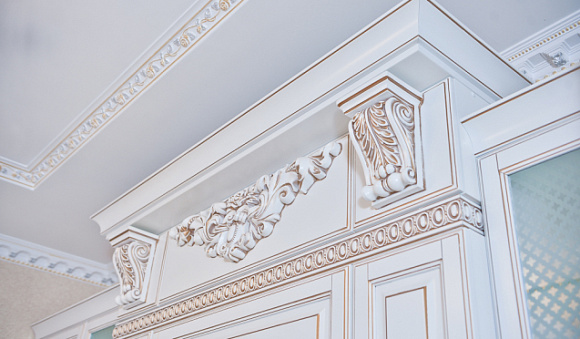 Самой популярной считается классическая кухня в золотом цвете. Свойственная этому стилю роскошная отделка в виде лепнины, барельефов и резных узоров полностью раскрывает красоту позолоты.