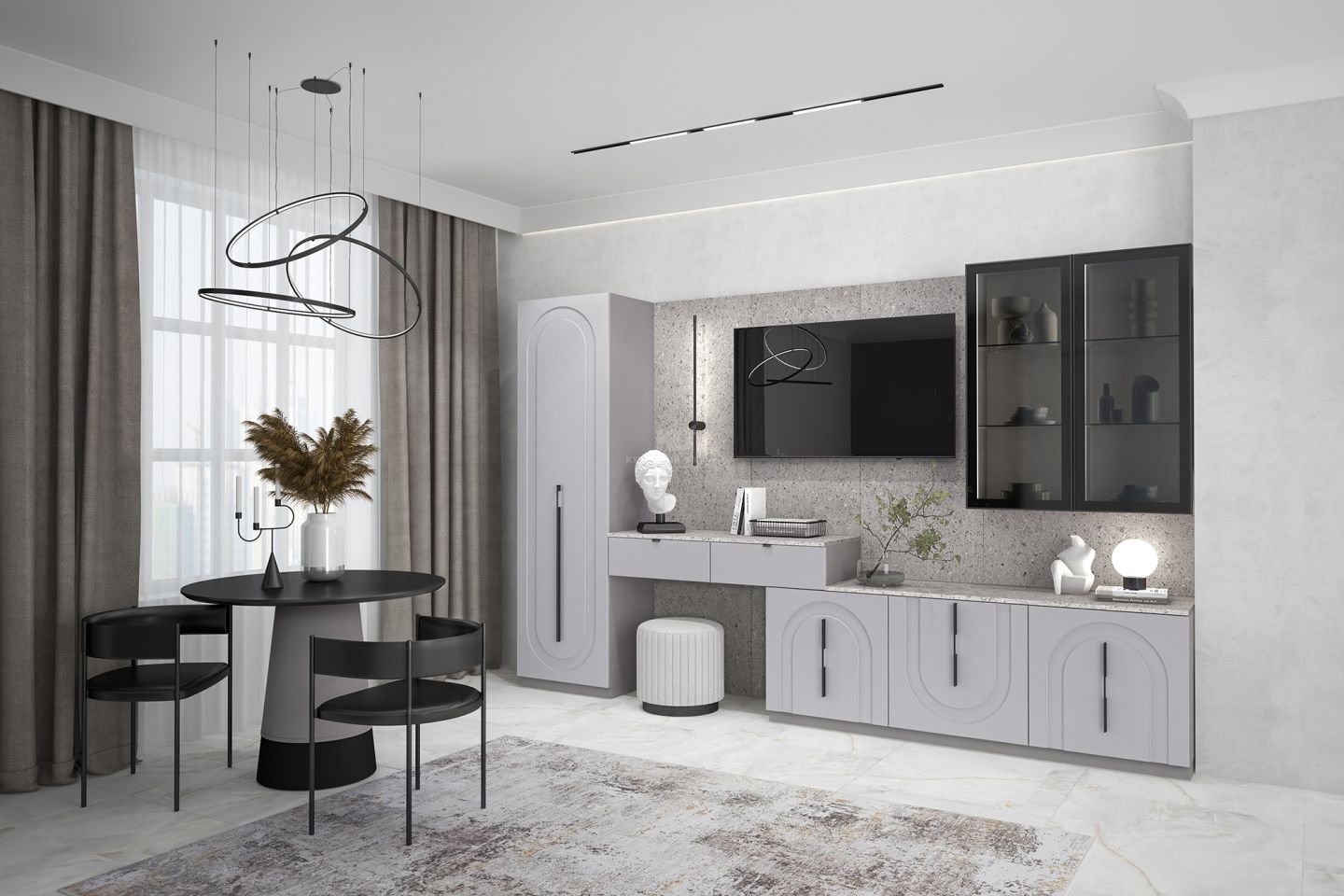 Арко — это больше, чем мебель. Это авторский подход к созданию жилого пространства, в котором каждая деталь продумана с инженерной точностью: мягкий матовый блеск фасадов, эргономичные вытянутые ручки, удобная система хранения, способная скрыть от глаз все лишнее. Здесь можно разместить книги, коллекции предметов искусства, технику, декор — при этом визуальная чистота и архитектурная цельность будут сохранены. Эта гостиная как галерея: она подчеркивает вкус хозяина и создает атмосферу интеллектуального уюта.