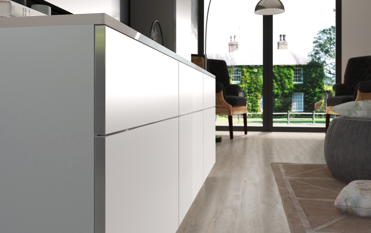 Эта модель соединяет в себе лаконичность модерна и самые трендовые дизайнерские решения. Для ее создания мы используем фасады с бархатистым покрытием «Extra Touch Matt», а также уникальные акцентные «металлические» кромки. Контрастное кромирование под золото, серебро или медь делает строгий дизайн модели «живым» и невероятно выразительным! А чтобы эта выразительность не утяжеляла интерьеры, мы добавили в образ фасады из стекла. Стекло и металлическая кромка прекрасно смотрятся вместе! Так и хочется взглянуть поближе!