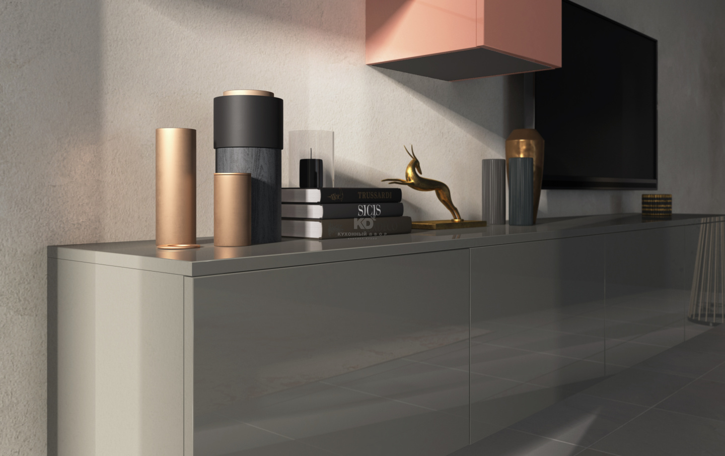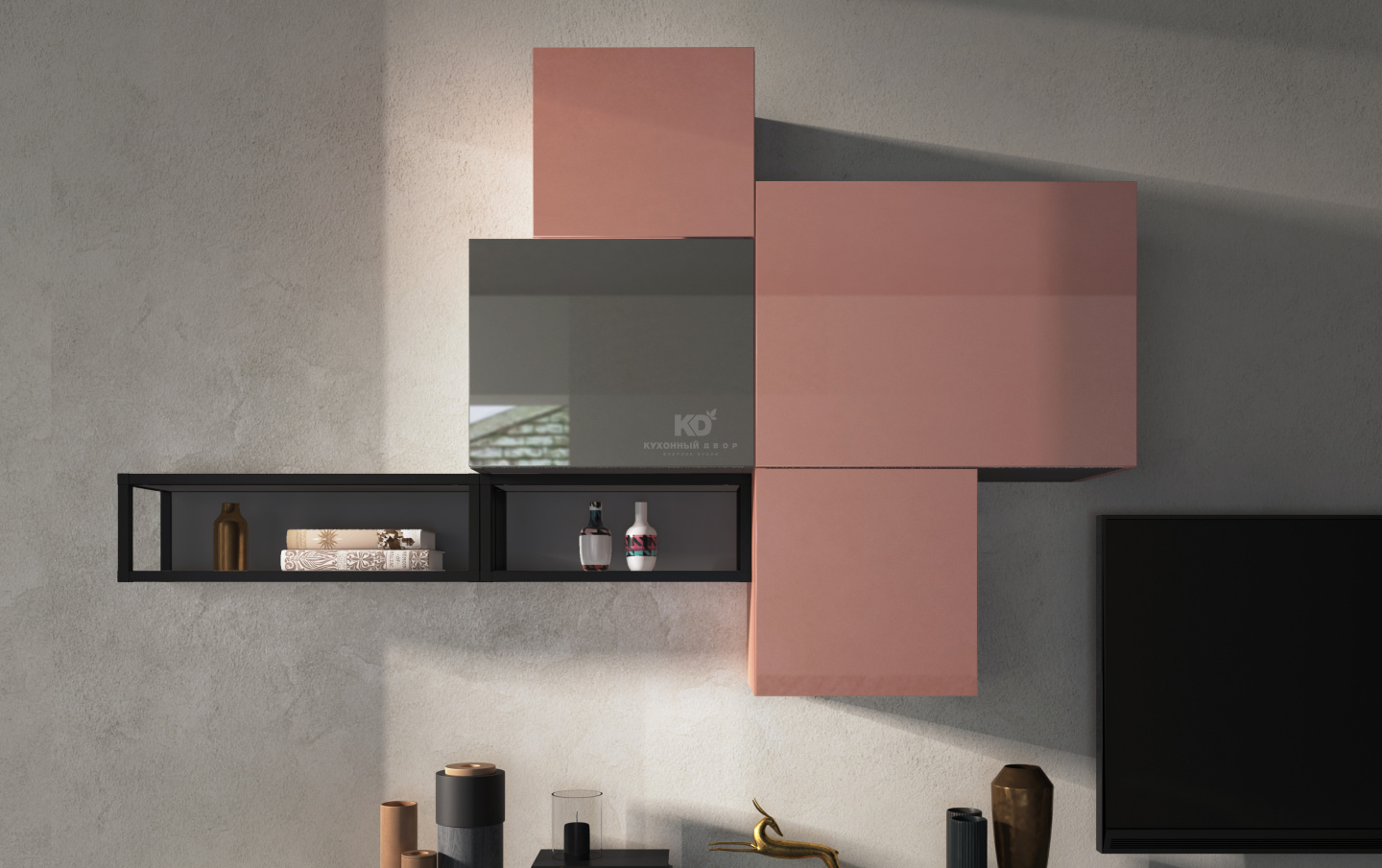 В стоимость включены: корпуса ЛДСП Egger (Германия), фасады выбранной категории, ящики, петли, подъемники, покрытие декоративное, ручки №2, цоколь Volpato (Италия), ножки, навесная система.