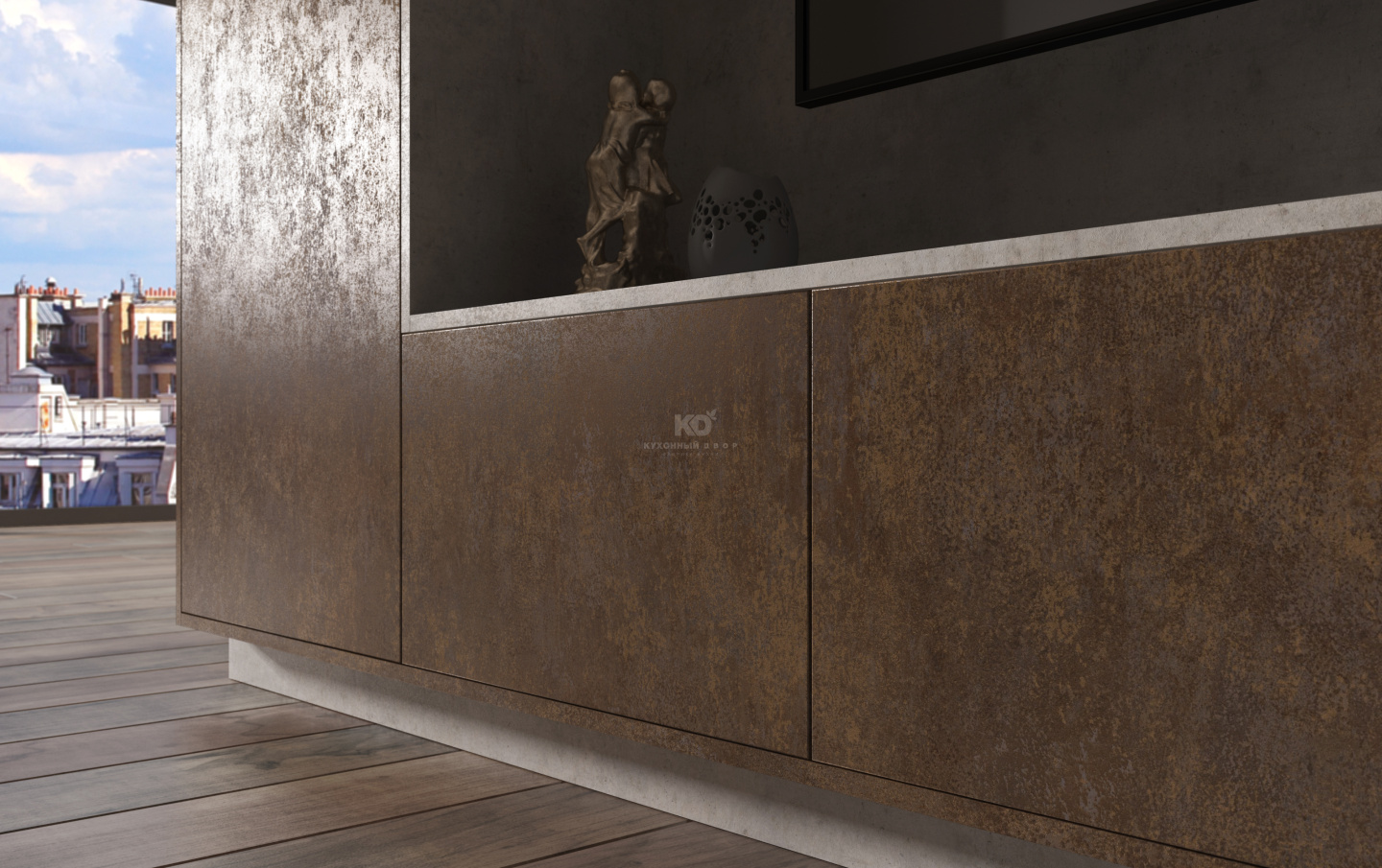 Брутальная внешность – то, что нужно для настоящего лофта! «Стоун» по части брутальности вне конкуренции. Эта модель готова стать главным «камнем» в фундаменте Вашего стильного и смелого интерьера. Секрет ее неповторимого облика, прежде всего, в использовании инновационных материалов. Фасады «Стоуна» созданы из экоплиты – композитного материала, способного имитировать практически любые фактуры. Поверхности этой гостиной могут выглядеть так, будто сделаны из бетона или ржавого металла!