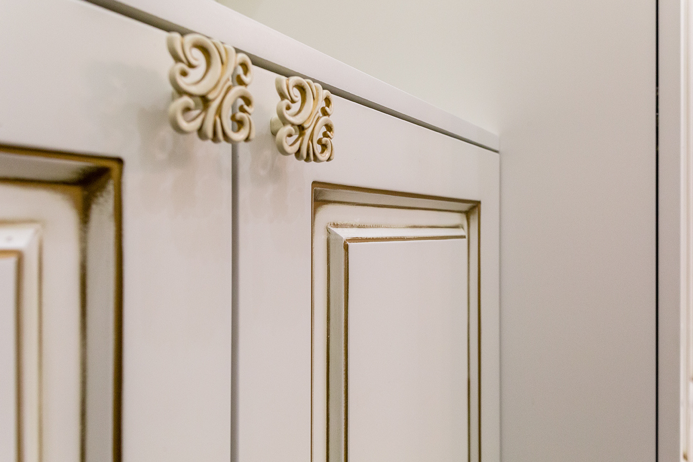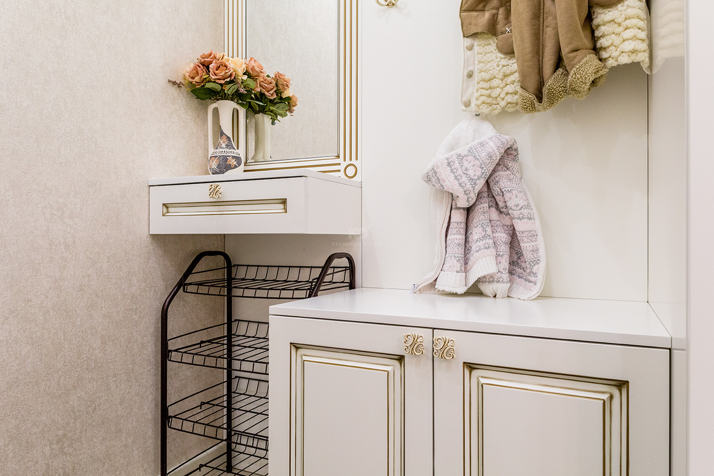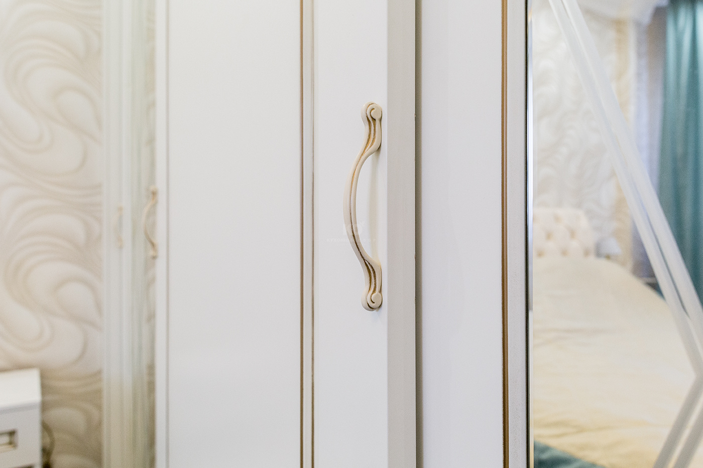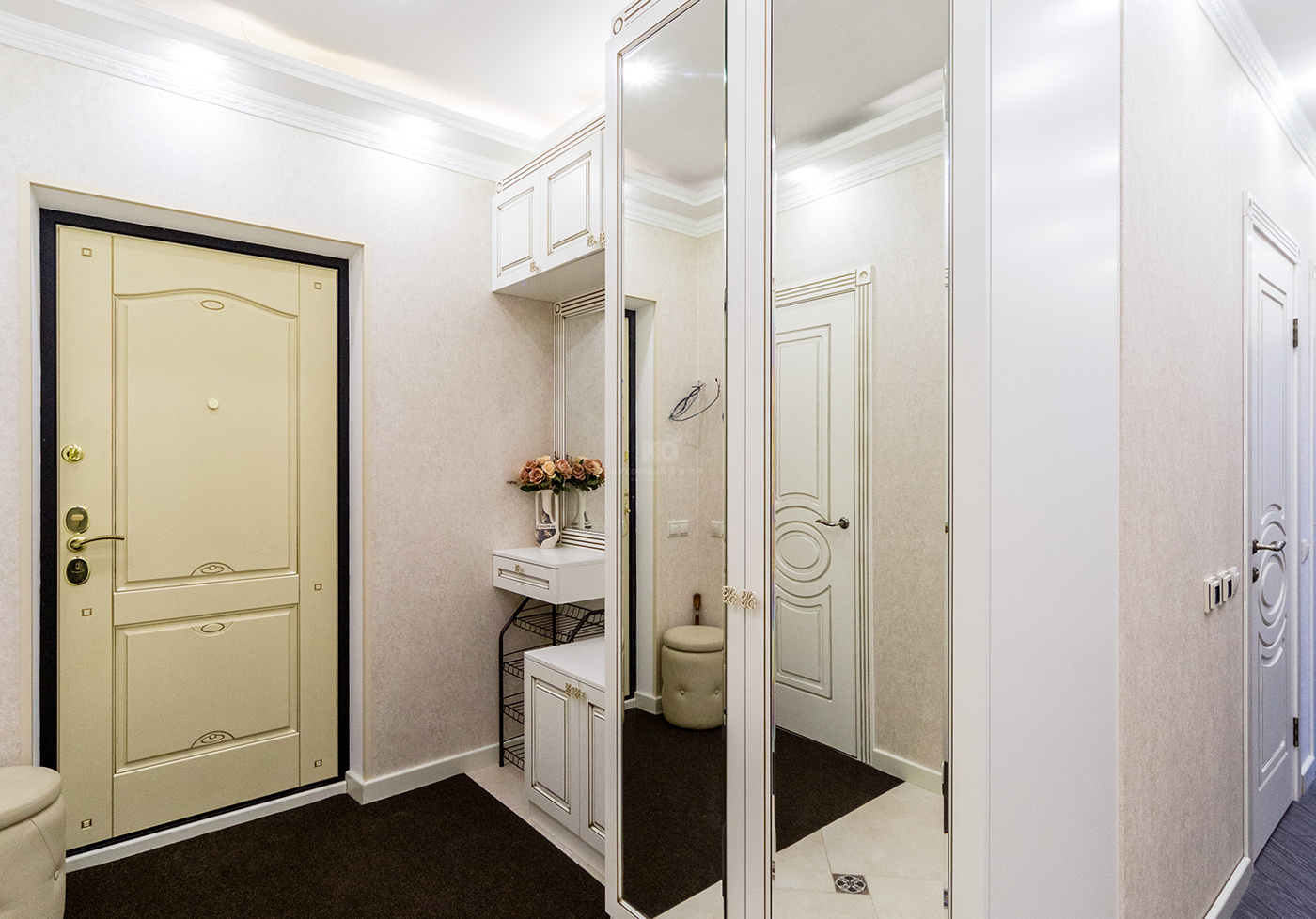 В дизайне мебели хозяйка решила сделать акцент на строгость и благородство. Ну, и «приправить» всё это простором, который дают белый и бежевый цвета. Фасады шкафов в прихожей патинированы, а также имеют классическую фрезеровку и невероятно красивые, витиеваты ручки. Гардероб оснащен двумя огромными зеркалами, которые, в сочетании с белым цветом, делают прихожую еще более просторной.