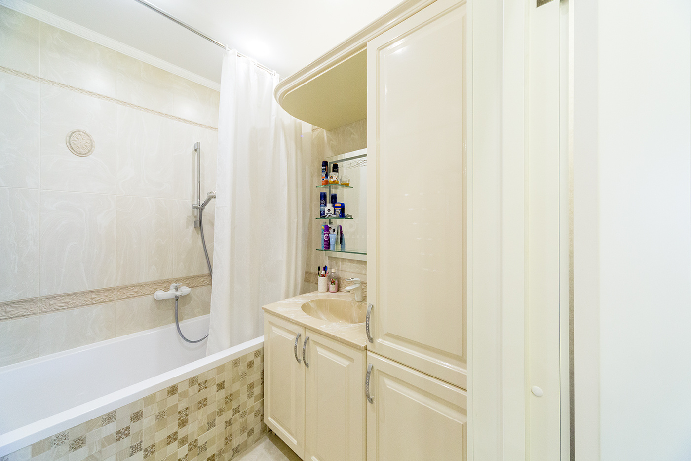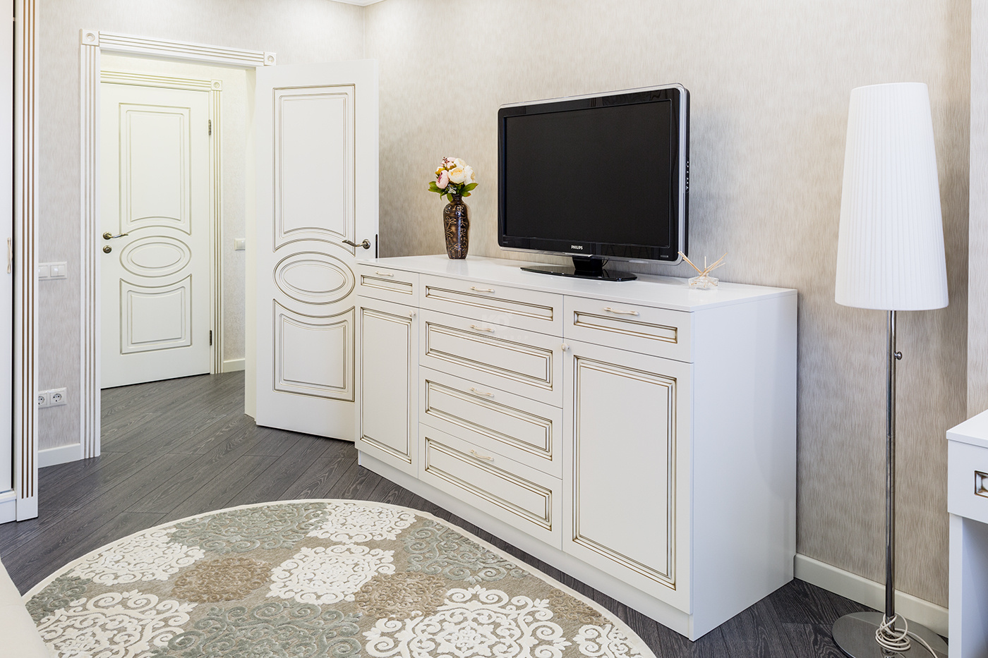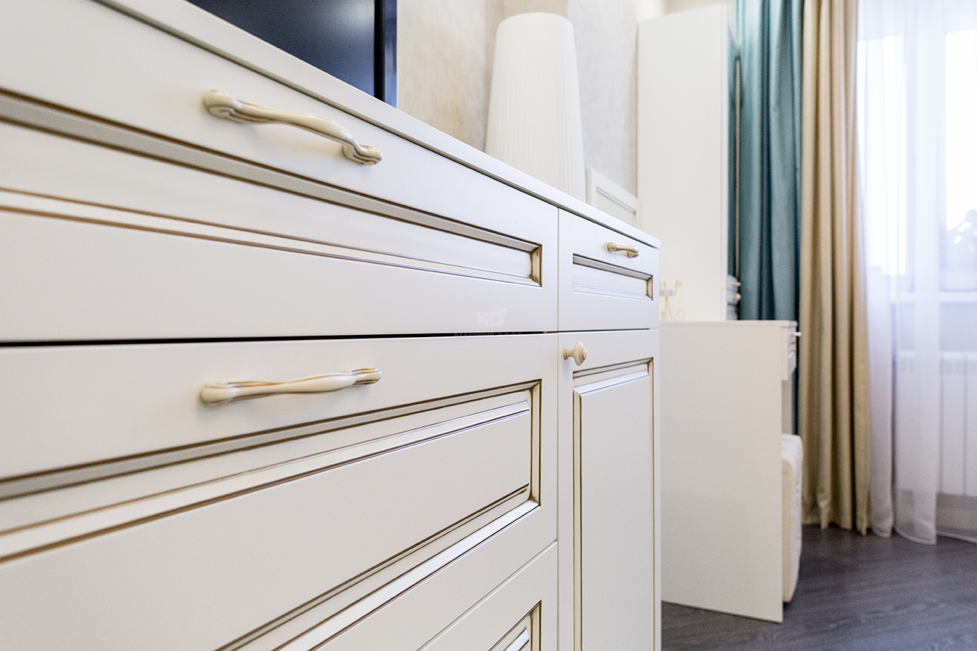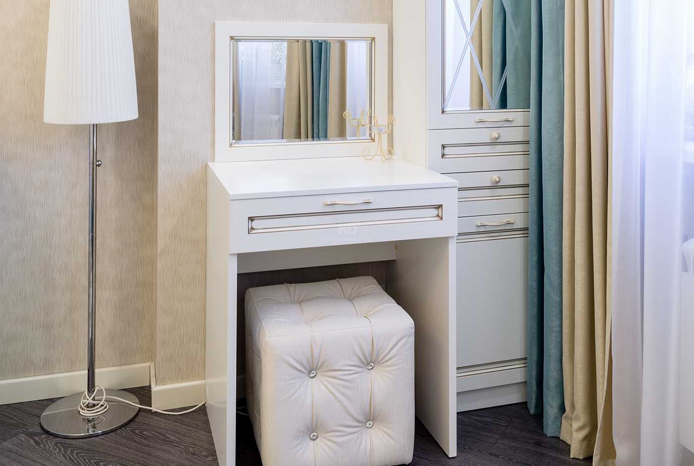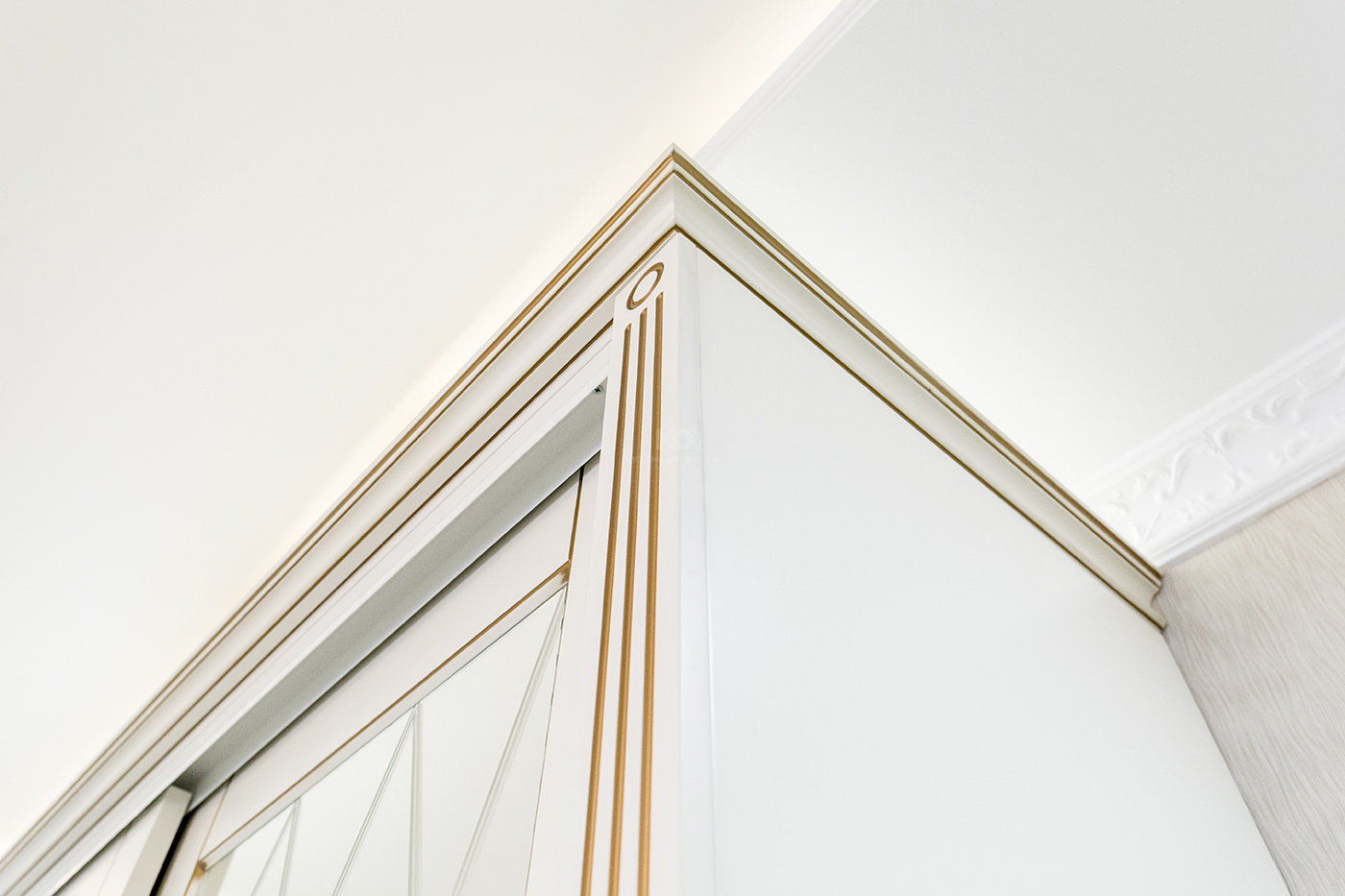 В дизайне мебели хозяйка решила сделать акцент на строгость и благородство. Ну, и «приправить» всё это простором, который дают белый и бежевый цвета. Фасады шкафов в прихожей патинированы, а также имеют классическую фрезеровку и невероятно красивые, витиеваты ручки. Гардероб оснащен двумя огромными зеркалами, которые, в сочетании с белым цветом, делают прихожую еще более просторной.